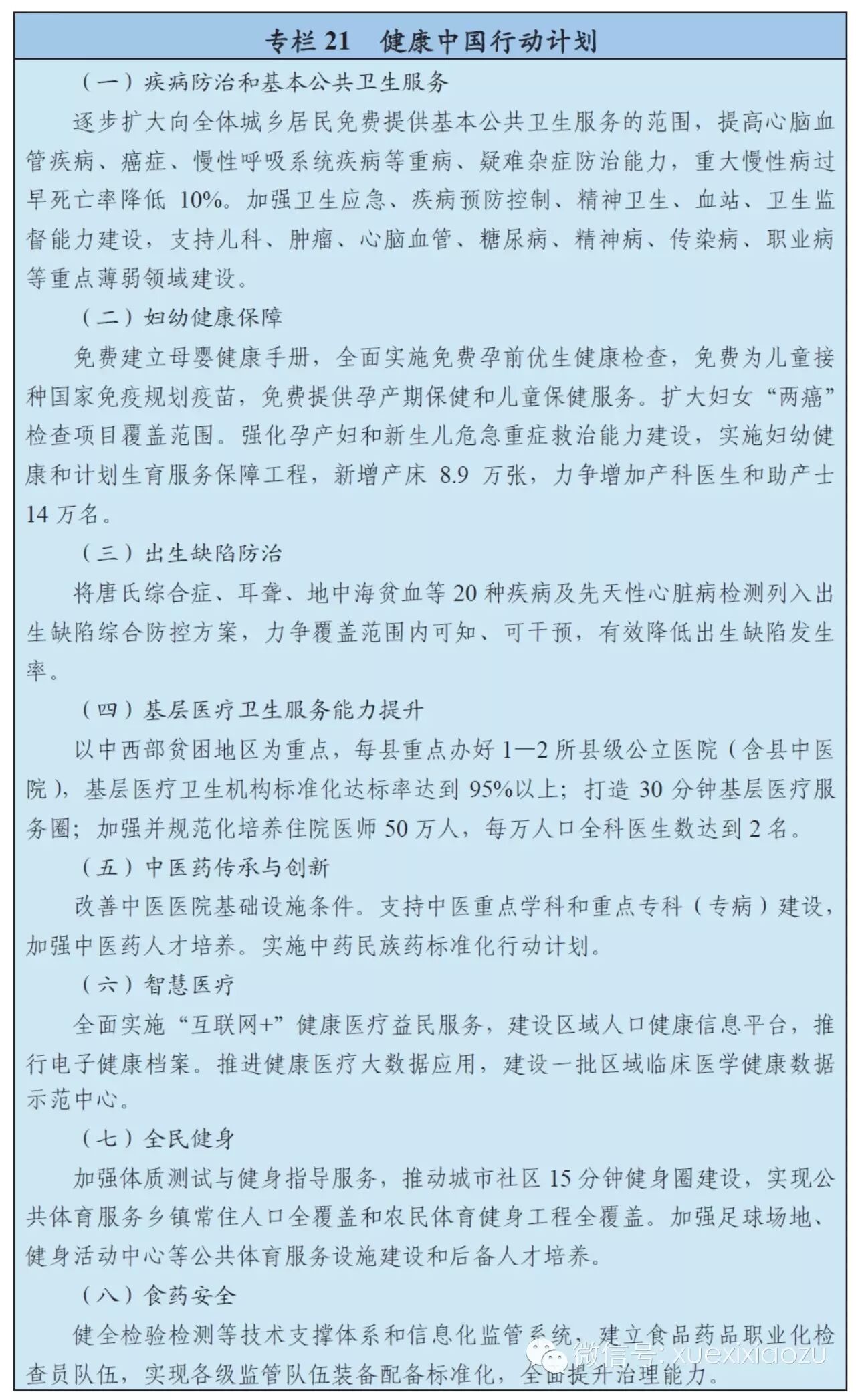 健全中医医疗保健服务体系,创新中医药服务模式,提升基层服务能力。加强中医临床研究基地和科研机构建设。发展中医药健康服务。开展中药资源普查,加强中药资源保护,建立中医古籍数据库和知识库。加快中药标准化建设,提升中药产业水平。建立大宗、道地和濒危药材种苗繁育基地,促进中药材种植业绿色发展。支持民族医药发展。推广中医药适宜技术,推动中医药服务走出去。