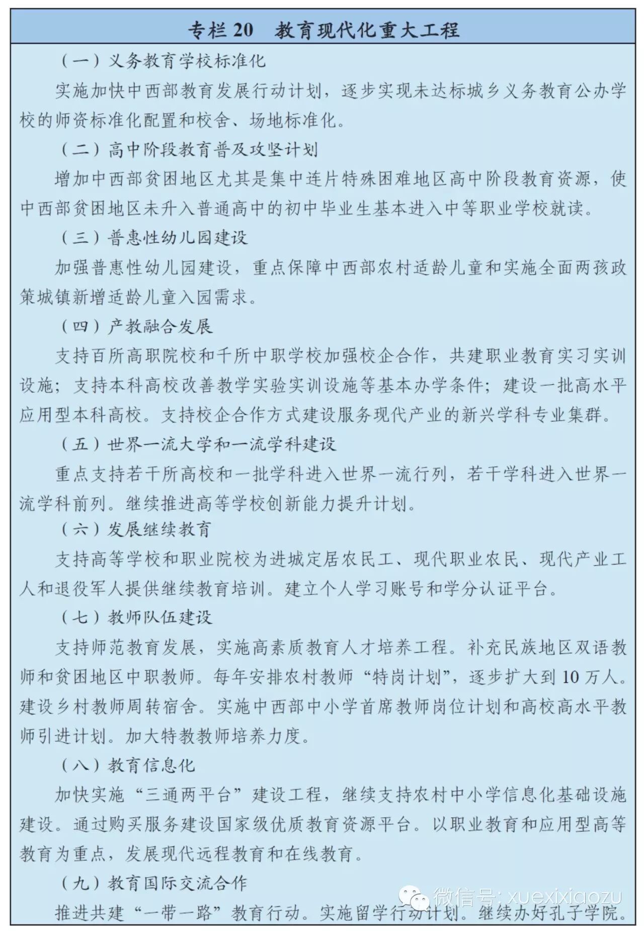 完善现代职业教育体系,加强职业教育基础能力建设。推动具备条件的普通本科高校向应用型转变。推行产教融合、校企合作的应用型人才和技术技能人才培养模式,促进职业学校教师和企业技术人才双向交流。推动专业设置、课程内容、教学方式与生产实践对接。促进职业教育与普通教育双向互认、纵向流动。逐步分类推进中等职业教育免除学杂费,实行国家基本职业培训包制度。